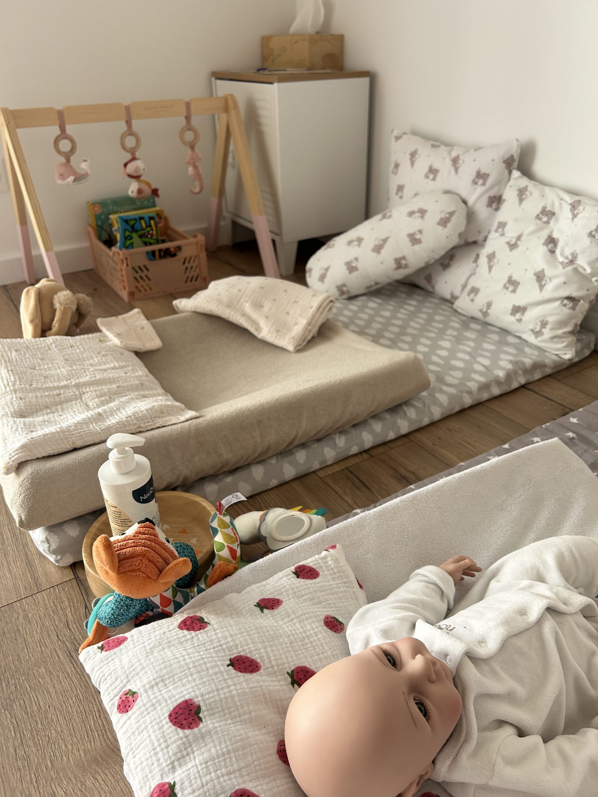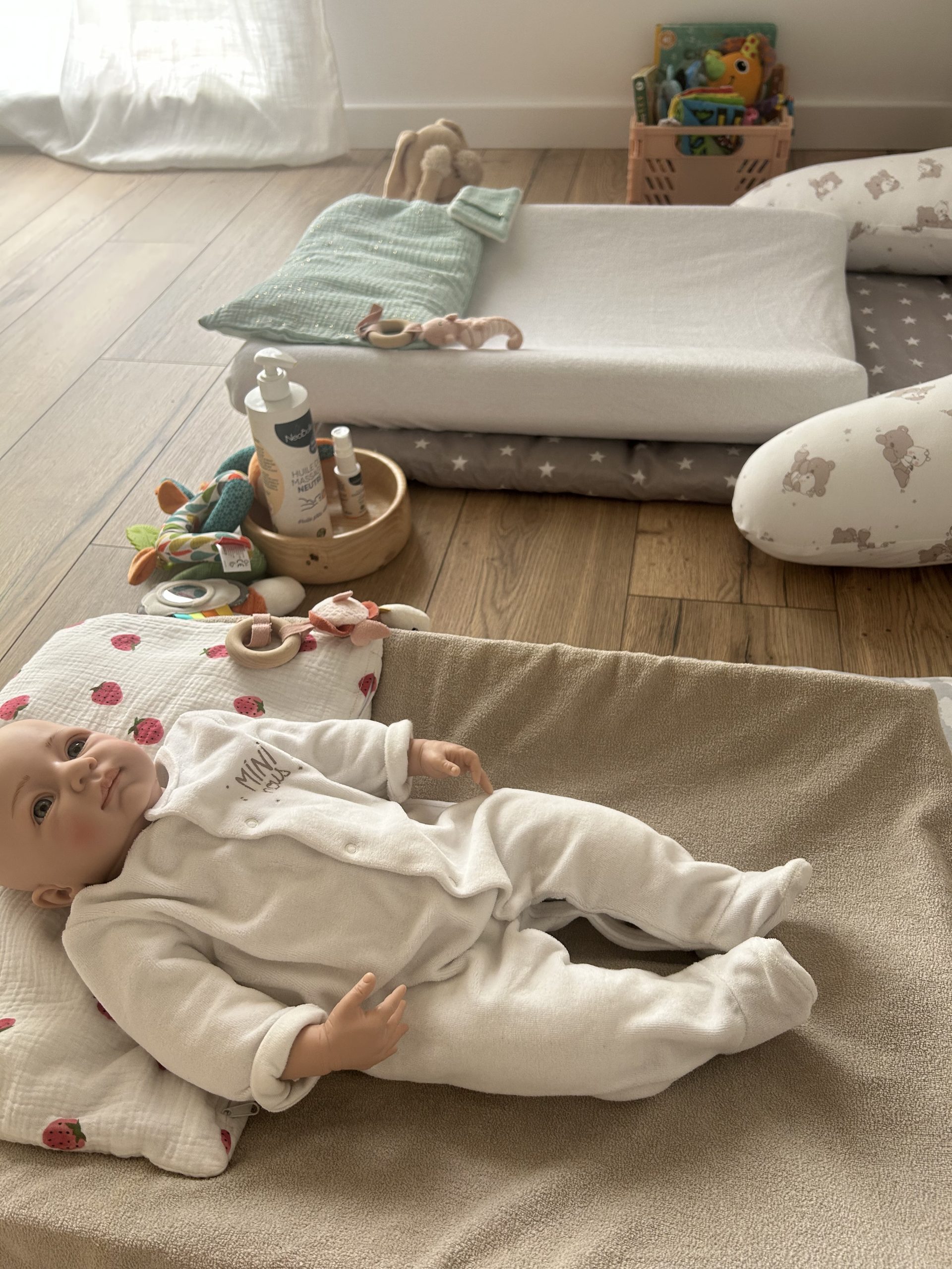 La séance se déroule dans un environnement douillet, sur un tapis de sol moelleux agrémenté de coussins. Bébé est installé près de vous, en position de confort. Vous pourrez ainsi pratiquer sereinement, tout en créant un moment de connexion profonde avec votre enfant.